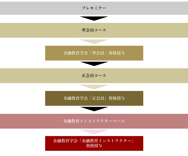 金融教育学会の講座は、プレセミナー、準会員コース、正会員コース、金融教育インストラクターコースの3コースで構成されています。